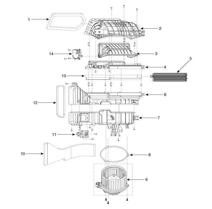 9. Двигатель вентилятора в сборе 10. Противошумная накладка 11. полевой транзистор 12. Уплотнение испарителя вентилятора 13. Воздушный фильтр 14. Впускной привод |
