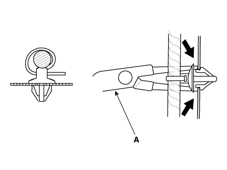 Вставьте плоскогубцы (A) под основание зажима и через отверстие под углом, а затем сожмите выступы расширения, чтобы освободить зажим.