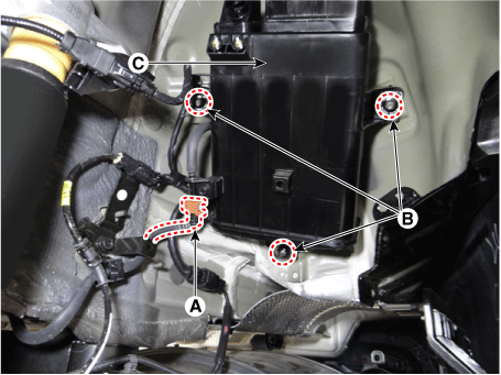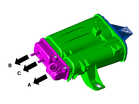 Снимите канистру в сборе (C) с автомобиля после снятия монтажные гайки (В).
