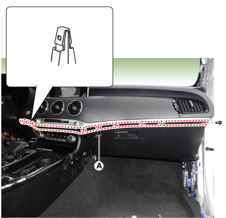 Отделите панель боковой панели пассажира (A) после ослабления крепления. винты.