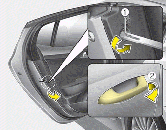 Чтобы открыть заднюю дверь, потяните за наружную ручку двери (2).