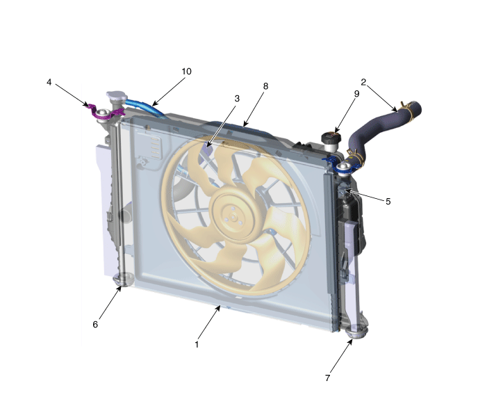 7. Изолятор нижнего крепления радиатора (левый) 8. Узел охлаждающего вентилятора 9. Резервуар 10. Шланг резервуара |