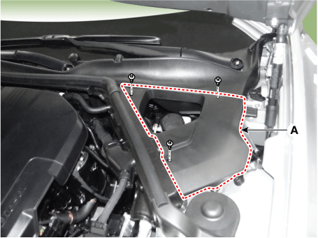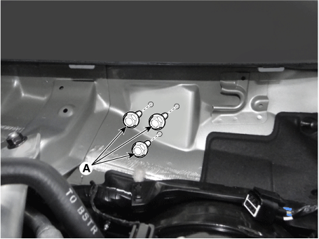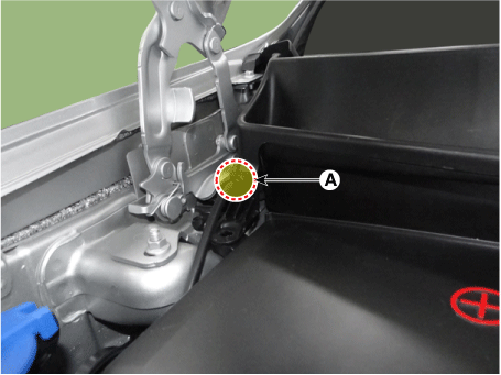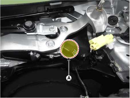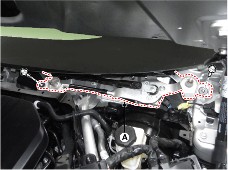 Снимите поперечину капота в сборе (А) после ослабления крепления. болты и гайки (А). [Сторона водителя]