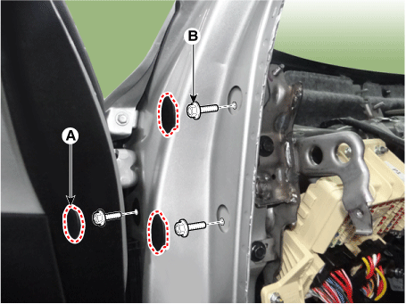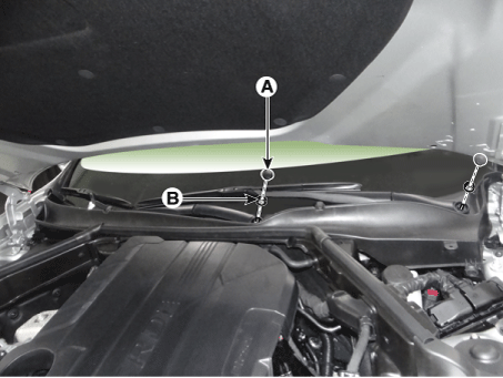 Ослабьте крепежные болты (B) после снятия крепления поперечной балки капота. крышки болтов (А).