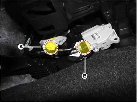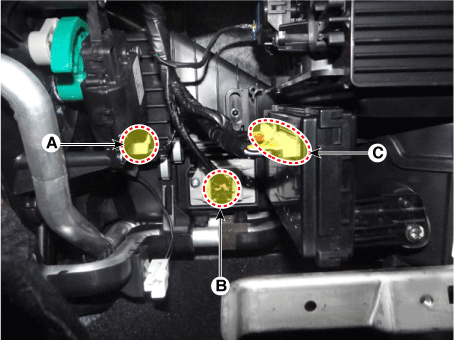 Отсоедините разъем датчика температуры (A) и разъем FET (B). и разъем блока управления отопителем (C).
