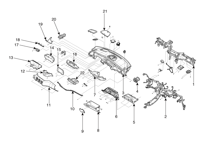 13. Кластерная панель верхней панели 14. Сборка кластера 15. Монитор А.В.Н. 16. фризовая панель монитора 17. Боковой переключатель аварийной площадки 18. Украшение Crash pad [LH] 19. Боковая панель водителя. 20. Боковой воздуховод [LH] 21. Решетка центрального динамика |
