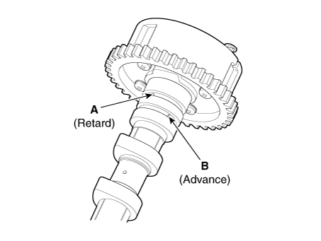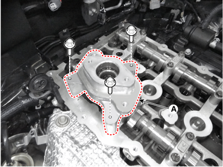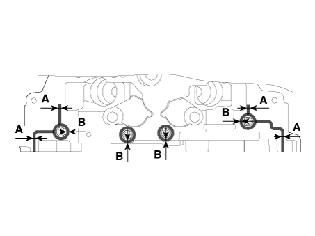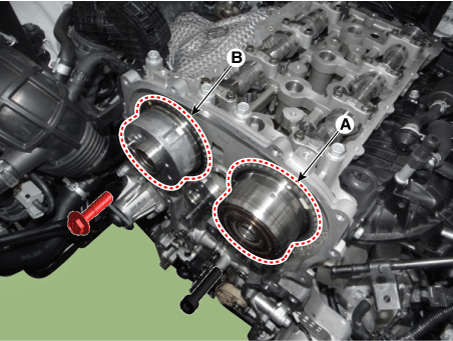 Отсоедините впускной узел E-CVVT (A) и выпускной узел CVVT (B).