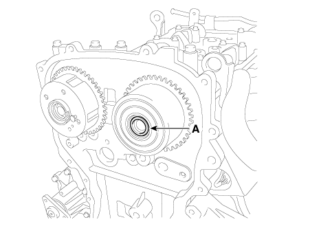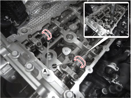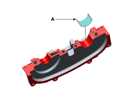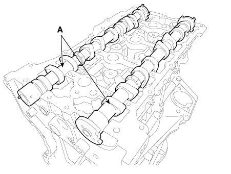 Установите верхний подшипник (А) выпускного распределительного вала на переднюю часть распределительного вала. крышка подшипника.