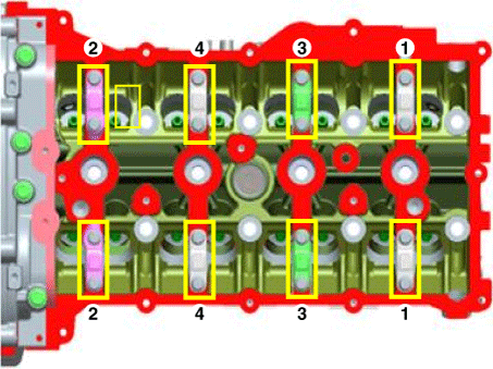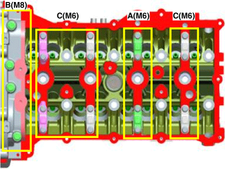 Установите крышки (А) подшипников распределительных валов на свои места. Порядок затяжки Группа А → Группа В → Группа С.