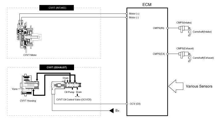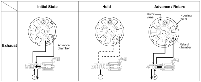 Эта система состоит из масляного регулирующего клапана CVVT (OCV), который подает масло в двигатель. масло в кулачковый фазовращатель или вытекает моторное масло из кулачкового фазовращателя в соответствии управляющим сигналом ECM PWM (Pulse With Modulation), который измеряет мощность двигателя. температуры масла и кулачковый фазовращатель, который изменяет фазу кулачка с помощью гидравлического сила моторного масла. Моторное масло, вытекающее из клапана управления маслом CVVT изменяет фазу кулачка в направлении (опережение впуска/запаздывание выпуска) или в противоположном направлении направлении (замедление впуска/опережение выпуска) вращения двигателя, вращая ротор соединен с распределительным валом внутри фазовращателя.