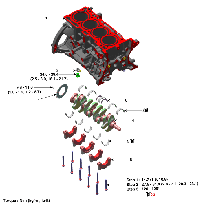 2. Масляная форсунка охлаждения поршня 3. Верхний подшипник коленчатого вала 4. Коленчатый вал |
