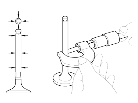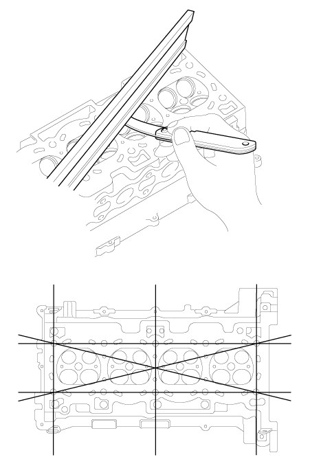 Осмотрите на наличие трещин. Проверьте камеру сгорания, впускные каналы, выпускные каналы и цилиндр. поверхность блока на наличие трещин. Если есть трещины, замените головку блока цилиндров. |