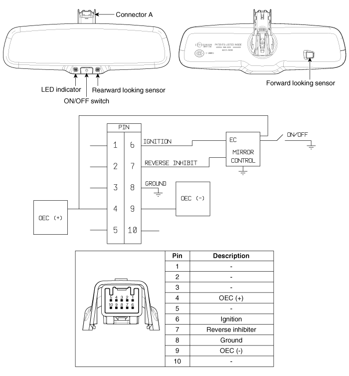 ECM (электрохроматическое внутреннее зеркало заднего вида) автоматически тускнеет, чтобы защитить глаза водителя, когда он чувствует свет, отражающийся от автомобиля позади. Датчик в зеркале определяет яркость и свет фар автомобиля сзади отражается на зеркале, химический слой внутри зеркала реагирует на бликов и регулирует коэффициент отражения от 10 до 70%. При переключении на задний ход механизм, зеркало становится ярким независимо от окружения. ЕСМ получает сигналы напряжения, заземления и передачи заднего хода, а также использует два датчика для измерения интенсивности вопиющего.
