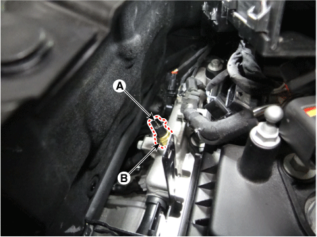 Отсоедините разъем датчика температуры охлаждающей жидкости двигателя (А). |