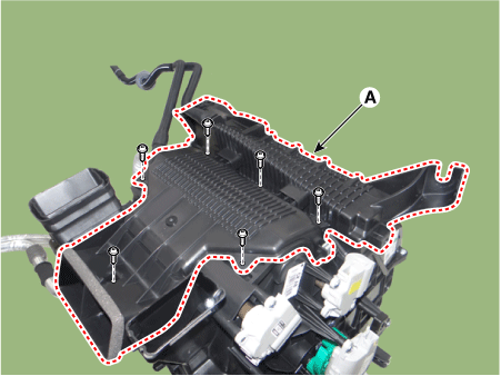 Снимите нижний корпус отопителя (А) после ослабления винтов.