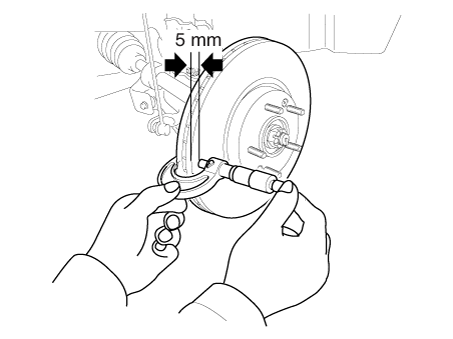 Поместите циферблатный индикатор примерно в 5 мм (0,2 дюйма) от внешней окружности тормозной диск и измерьте биение диска.