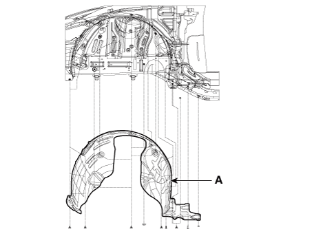 Ослабив крепежные зажимы, гайки, болты и винты, снимите защита переднего колеса (А).