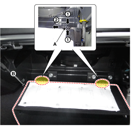 Снимите стопорные штифты (А), затем снимите перчаточный ящик (В).