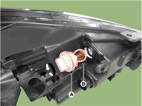 Снимите патрон лампы (А) и лампу (В) с фары в сборе.