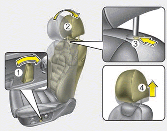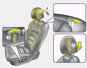 3. Нажмите кнопку фиксатора подголовника (3), потянув подголовник вверх (4).