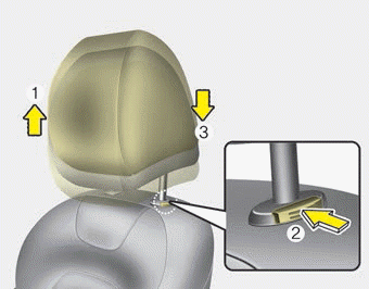 Чтобы поднять подголовник, потяните его вверх в нужное положение (1). Чтобы опустить подголовник, нажмите и удерживайте кнопку фиксатора (2) на опоре подголовника и опустите подголовник в нужное положение (3).