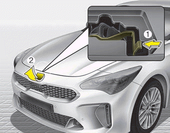 2. Подойдите к передней части автомобиля, слегка приподнимите капот, нажмите на вторичный защелку (1) с левой стороны капота по центру и поднимите капот (2).