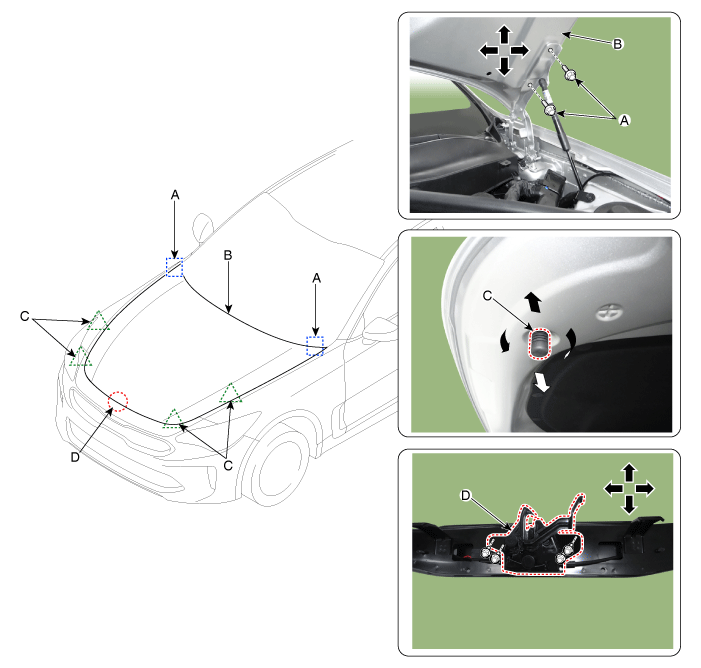 Ослабив болты крепления защелки капота (D), отрегулируйте защелку на перемещая его вверх и вниз или вправо и влево.