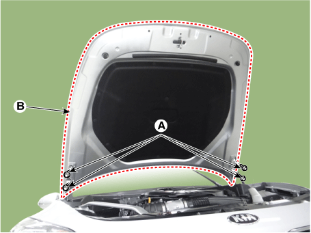 Ослабив болты крепления петли капота (А), снимите капот в сборе. (Б).
