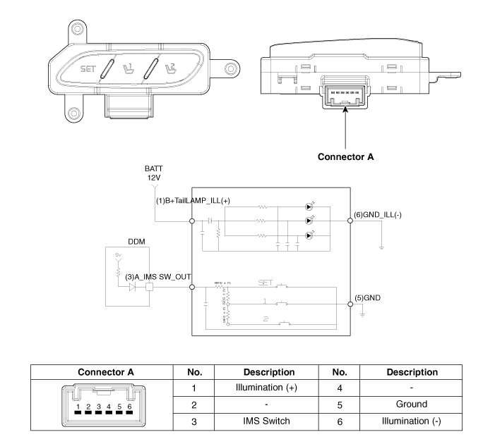 При нажатии каждого переключателя проверьте поток электроэнергии между интегрированными разъем переключателя сиденья с памятью и заземление, и если электричество не соответствует спецификации, замените переключатель.