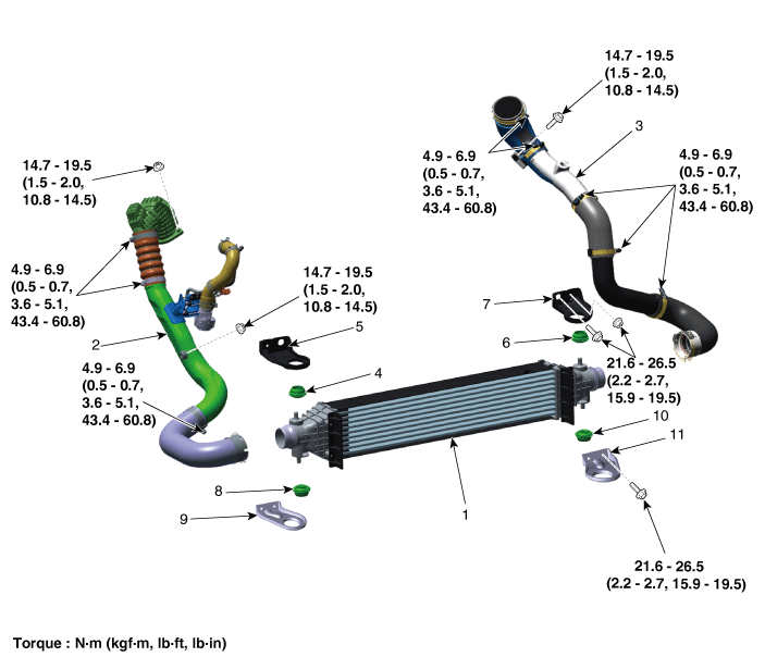 2. Впускной шланг и трубка промежуточного охладителя 3. Выпускной шланг и трубка промежуточного охладителя 4. Изолятор верхнего крепления интеркулера (правый) 5. Верхний кронштейн интеркулера (правый) 6. Изолятор верхнего крепления интеркулера (левый) |