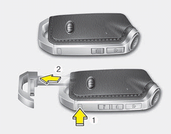 Чтобы снять механический ключ (2), нажмите и удерживайте кнопку разблокировки (1) и извлеките