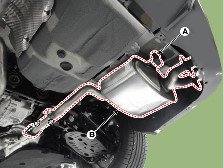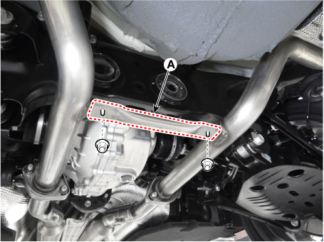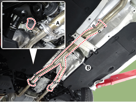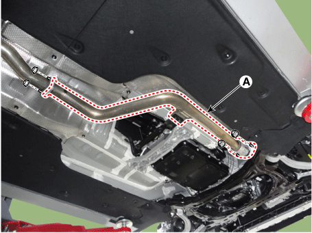 Отсоедините резиновую подвеску (А) от центрального глушителя. |