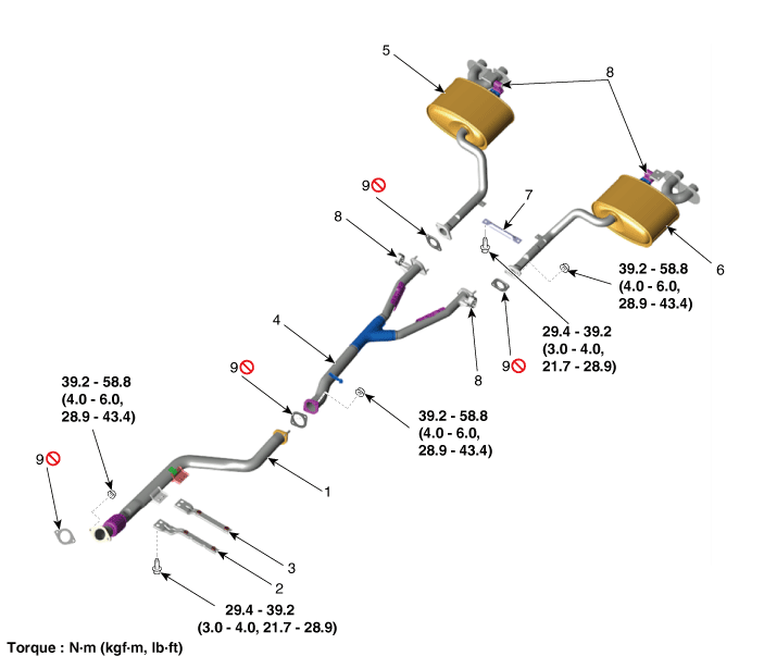 2. Кронштейн переднего глушителя (2WD) 3. Кронштейн переднего глушителя (полный привод) 4. Центральный глушитель 5. Задний глушитель (правый) |