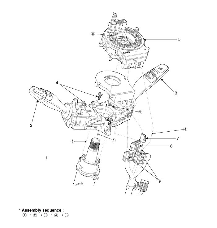 6. Соединители часовой пружины 7. Разъем датчика угла поворота рулевого колеса. 8. Многофункциональный разъем |