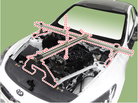 Соберите опору двигателя в машинном отделении. (См. Специальные сервисные инструменты — «Сборочный чертеж крепления опоры двигателя»)