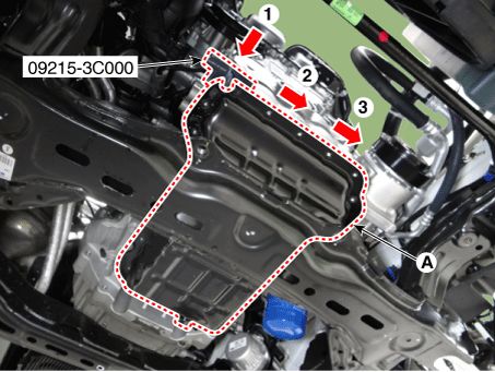 Снимите гайку опорного кронштейна подвески двигателя (А).