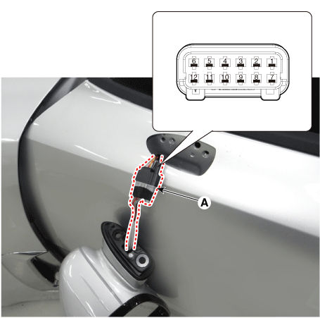 Отсоедините разъем наружного зеркала заднего вида с электроприводом (А) от жгута проводов.