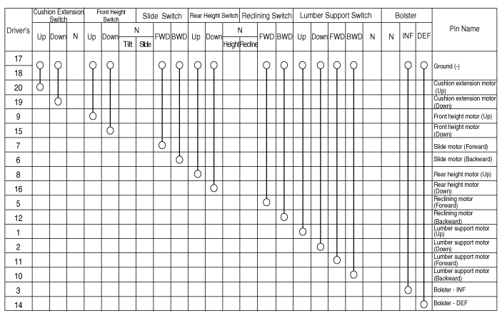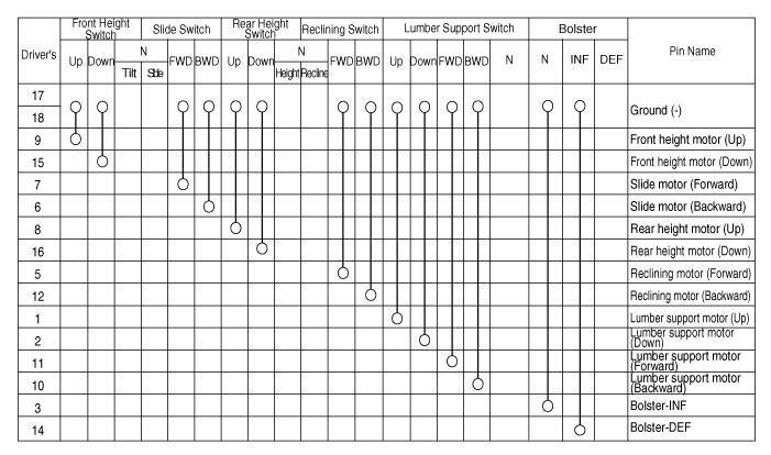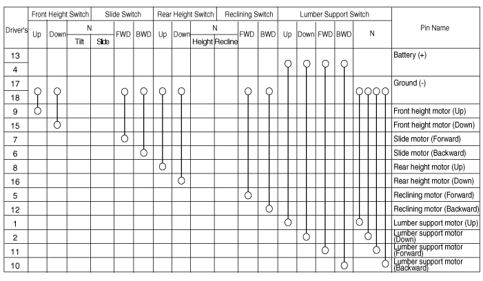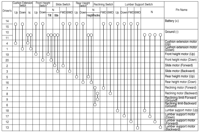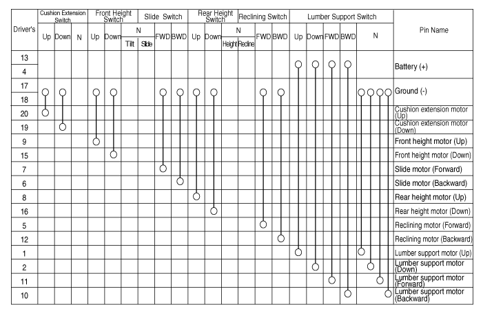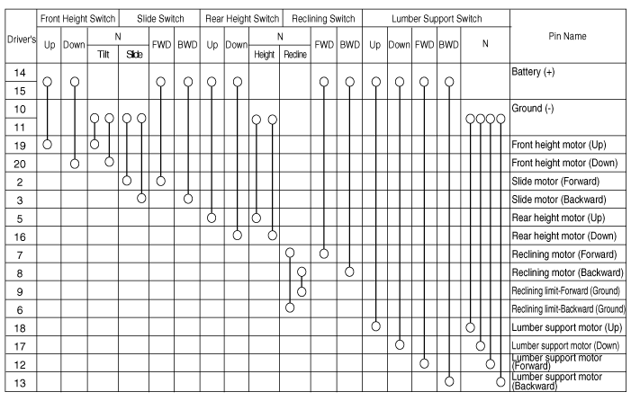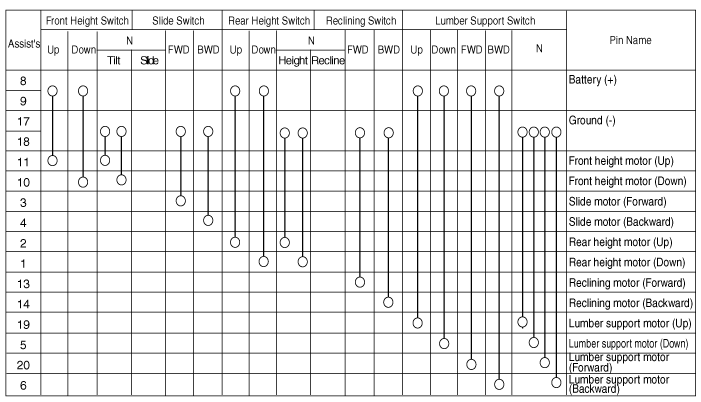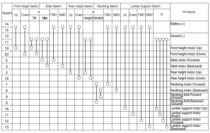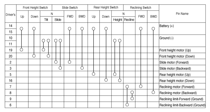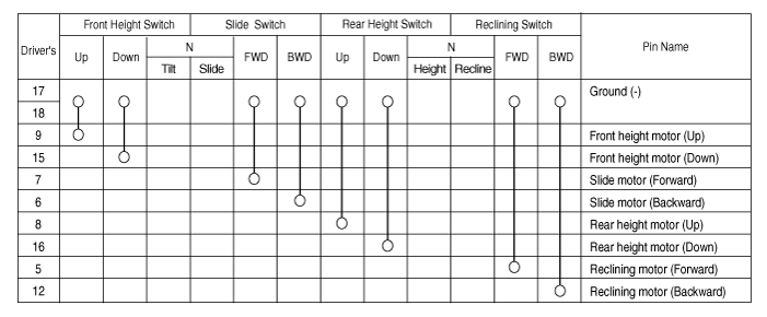 Когда переключатель сиденья с электроприводом находится в каждом положении, убедитесь, что непрерывность существует между терминалами ниже. Если непрерывность не соответствует указанной, замените переключатель сиденья с электроприводом.
