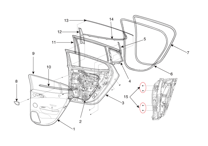 10. Внутренний уплотнитель ремня задней двери. 11. Стеклоподъемник задней двери 12. Отделка коробки задней двери 13. Молдинг коробки задней двери 14. Наружный уплотнитель ремня задней двери 15. Петля задней двери |