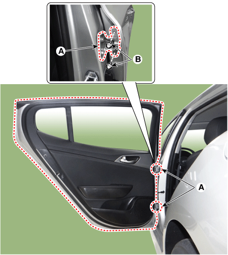 Снимите заглушку отверстия крепления стекла задней двери (А).