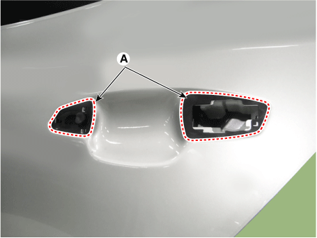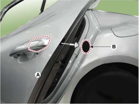 Снимите заглушку отверстия (B), а затем снимите наружную ручку задней двери. крышку (A) после ослабления крепежного болта.