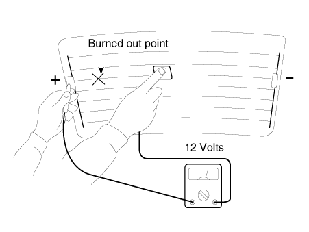 Включите переключатель обогревателя и с помощью вольтметра измерьте напряжение. каждой линии нагревателя в центральной части стекла. Если вольтметр показывает 6В для токоведущей линии, линией заднего стекла считается в хорошем состоянии.