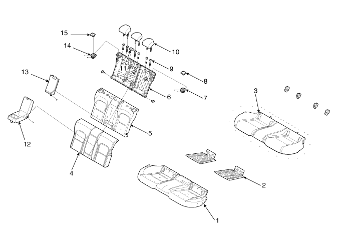 10. Подголовник заднего сиденья 11. Крышка центрального ремня безопасности заднего сиденья 12. Подлокотник заднего сиденья 13. Спинка подлокотника заднего сиденья 14. Ручка складывания спинки заднего сиденья [RH] 15. Крышка ручки складывания спинки заднего сиденья [RH] |
