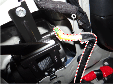 Отсоедините разъем преднатяжителя ремня безопасности (А), а затем снимите преднатяжитель ремня безопасности.