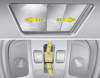 Потяните рычаг управления люком назад во 2-е фиксирующее положение, и оба солнцезащитный козырек и стекло люка полностью откроются.
