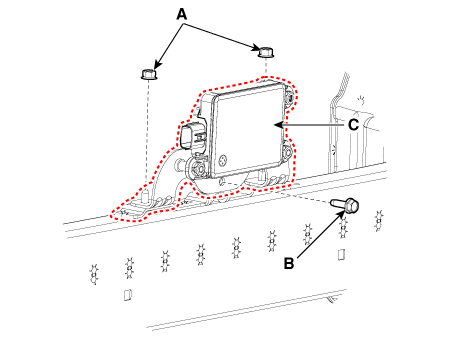 Ослабьте гайки (А) и болт (В) переднего радара, затем снимите переднюю радар (С).
