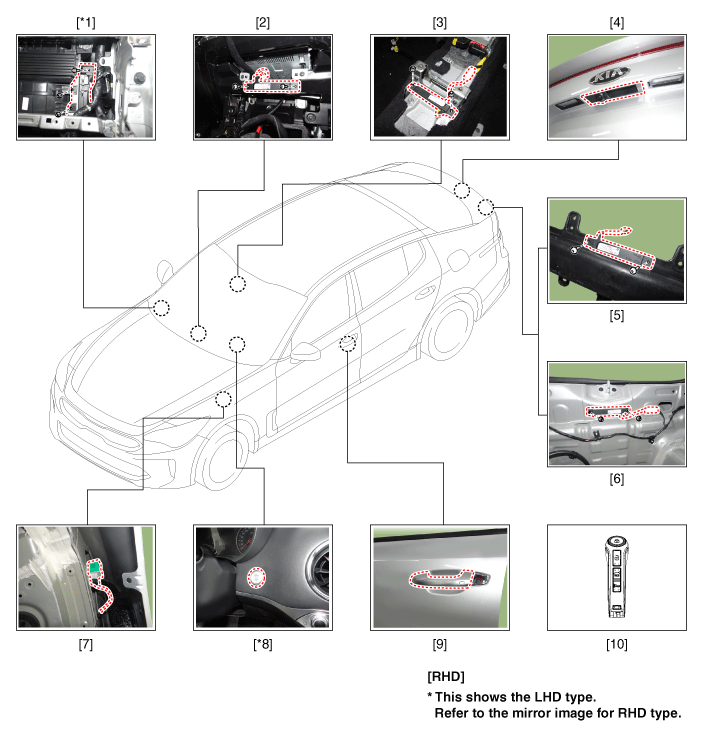2. Внутренняя антенна 1 3. Внутренняя антенна 2 4. Переключатель открытия задней двери 5. Бамперная антенна |