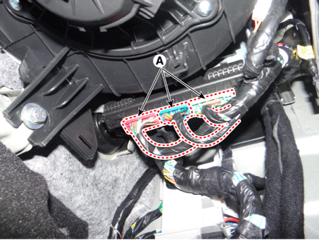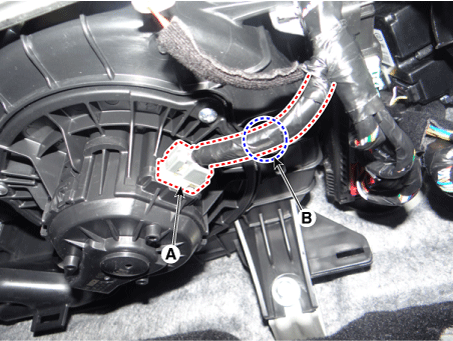 Отсоедините разъем электродвигателя вентилятора (А) после снятия крепления. зажим (В).