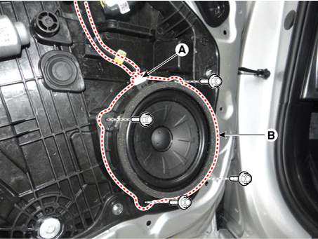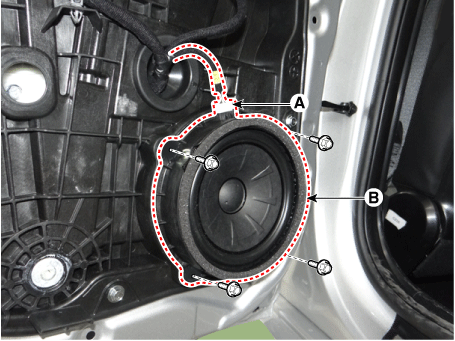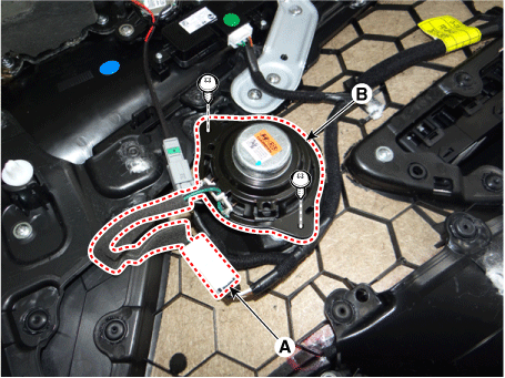 Снимите динамик задней двери (B), предварительно отсоединив разъем (A). и ослабление болтов крепления.