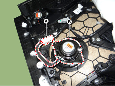 Снимите динамик передней двери (B), предварительно отсоединив разъем (A). и откручивание болтов.